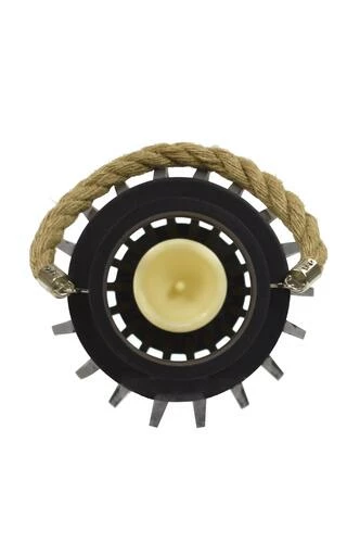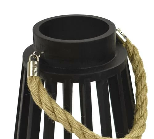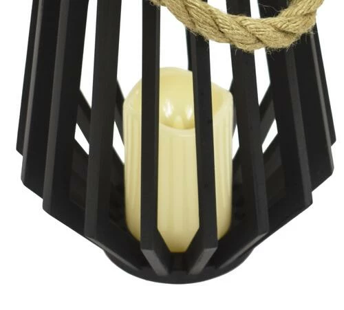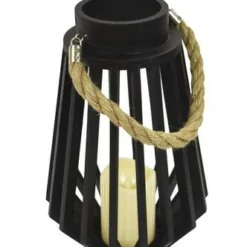 Decorate your home with this wooden lantern with a flameless LED candle. Flame-free, smoke-free and worry-free candles let you enjoy the ambiance of candlelight safely. Comes in black with a rope handle. The candle will stay on for 5 hours and off for 19 hours. It uses 3 “AAA” batteries. Batteries are sold separately.