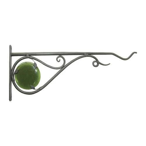 Scrolls and stained glass highlight this heavy-duty plant bracket to display any hanging basket. A green glass disc sits in the center of the curving rod held in place by three metal leaf shapes. An upward curl at the end of the main rod accommodates bird feeders or baskets up to 16″ in diameter. The powder-coated finish protects the bracket from rust.