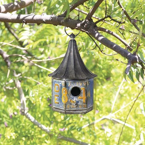 This bird house looks like a rustic license plate that has been creatively repurposed. It’s sure to look great in your yard or as a decorative item in your home.