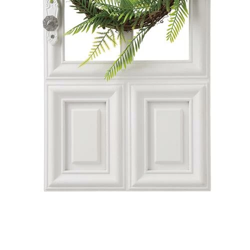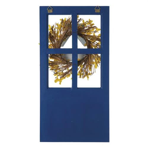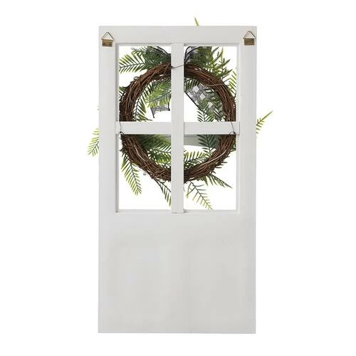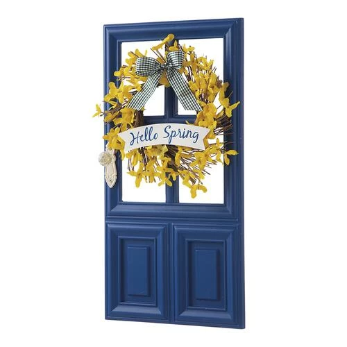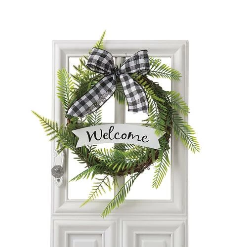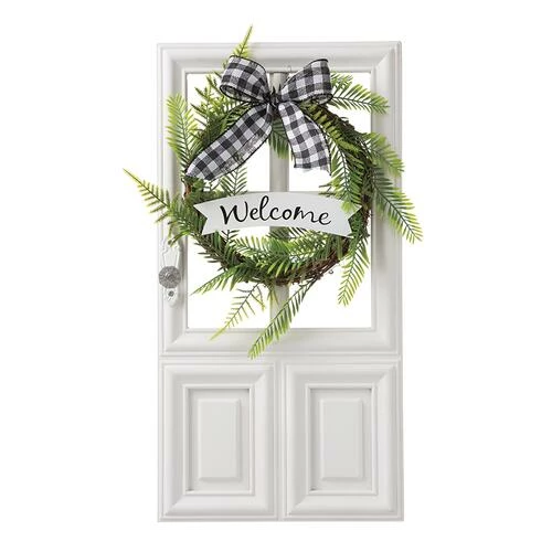 This is a fully wooden framed sign. Decorated with a green wreath, yellow flowers, and a fabric plaid bowknot.