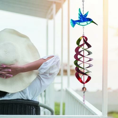 This glossy metal swirling hummingbird is complete with an acrylic pendant. It’s a great addition to your indoor or outdoor space.