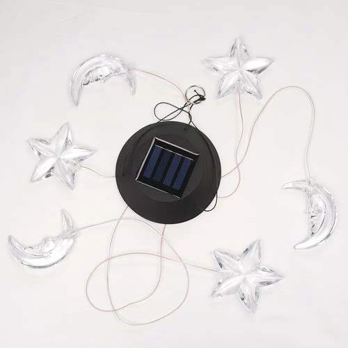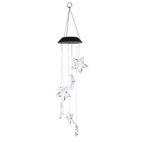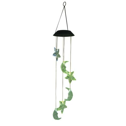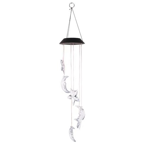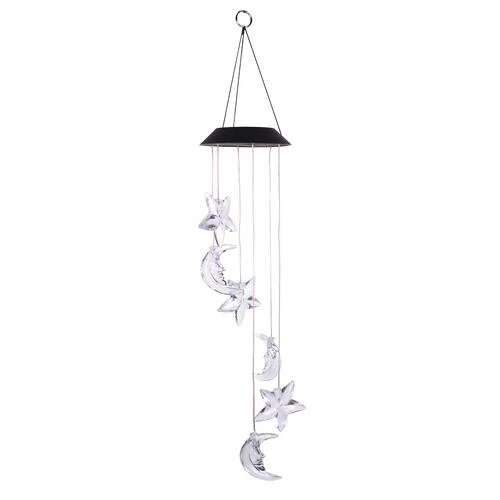 This Solar Star/Moon Wind Chime will add sparkle and fancy to your garden or porch. The solar panel uses the sun to charge up during the day, while illuminating your charming outdoor spaces with color-changing LEDs at night. Made of durable PVC, each Moon and Star is clear to showcase the beauty of the lights when light up.