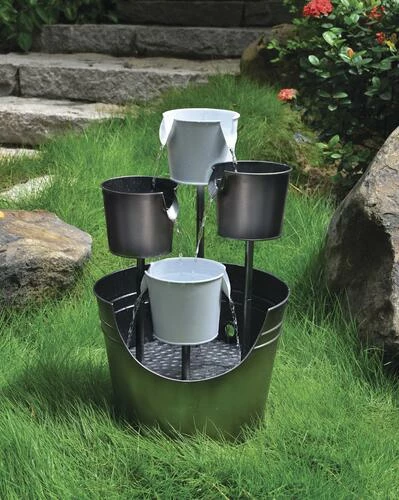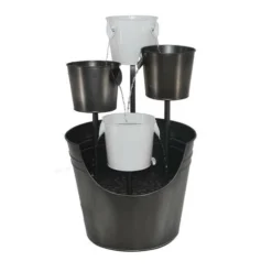 Appreciate the symmetry in this Pouring Pails Water Fountain with the white and dark grey balanced pails as they pour through their spouts into the receiving basin below. The clear sound of the water cascading from one pail to the next, and then splashing gently below is a welcoming balm to the ears. Simple assembly is required, and then with the addition of water, plug it in and you are ready to go! Create a focal point in your garden by placing this fountain along a pathway, or amid a colorful flowerbed. The neutral color palette stands out from green lush shrubs, or at the entry to your backyard oasis.