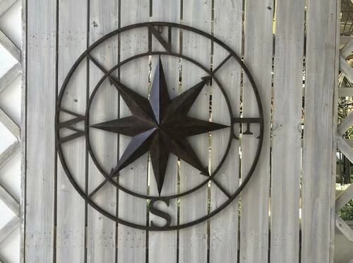 This Metal compass wall art is made from metal material and is bronze in color. This alluring design strikes an open circle frame in a rustic painted finish. The center of the piece showcases a raised eight-pointed star, while the border of the circle holds navigational directions N, E, S, and W. Decorate the walls of your home, office or garden with this wonderful piece of hanging art. It is easy to hang with a hidden metal loop. Each sold separately.