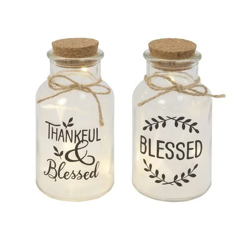 Light up any space with this 5.8″H battery operated bottle decor. There are 2 styles to choose from, sayings are “Thankful and Blessed” and “Blessed”.