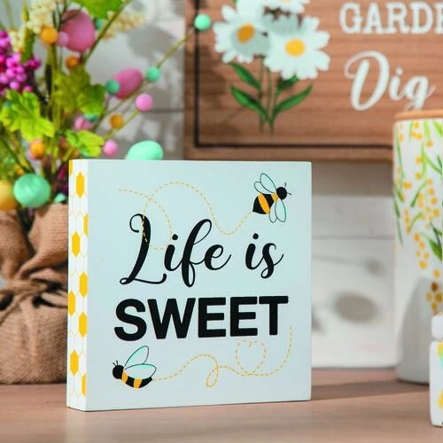 This sign decor is made of MDF with words “Life is Sweet”. This cute sign has a white background and is decorated on each side with yellow polka dots and bees. Product size: 5.91″LX1.25″WX5.91″H.