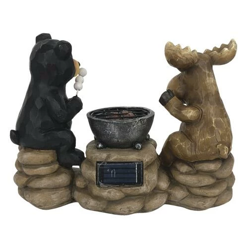 Add some charm to your garden, patio or yard with this adorable solar statue featuring a moose and bear gathered by a campfire that will lighted at night. During the day, this energy-efficient solar powered statue utilizes the sunlight to charge its internal batteries. After dark, it will automatically turn on, emitting a soft attractive glow.