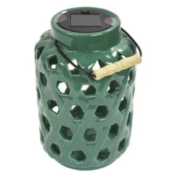 Decorate your home with this solar powered ceramic lantern with an LED light. Flame-free, smoke-free and worry-free candles let you enjoy the ambiance of candlelight safely. Made of ceramic and comes in a green. Includes a rechargeable battery and uses the sunlight to charge. Made for outdoor use.