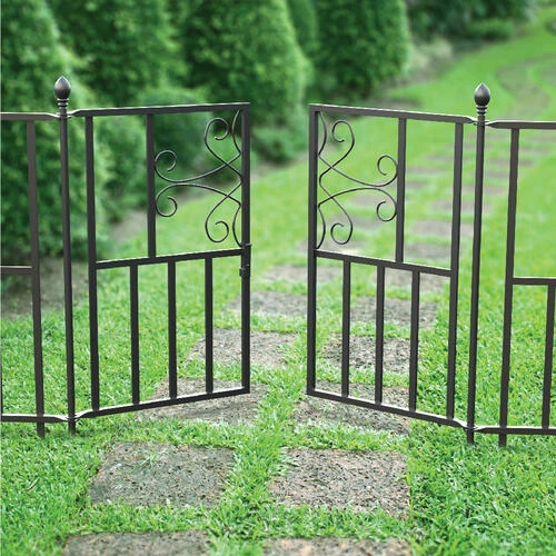 The Deluxe Scroll Gate works in union with the Scroll Fence System. Combine fence panels, end panel and posts then stake into the ground to support the fencing. The small metal hinge on one of the gate sections swings down, connecting to the other section for a latch. 27 inches high, this gate completes the perfect border to any yard or garden.
