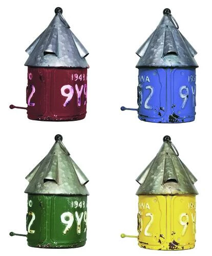 This license plate bird house decorative piece features a rustic sheet metal aesthetic. Includes hanging ring. Available in 4 colors